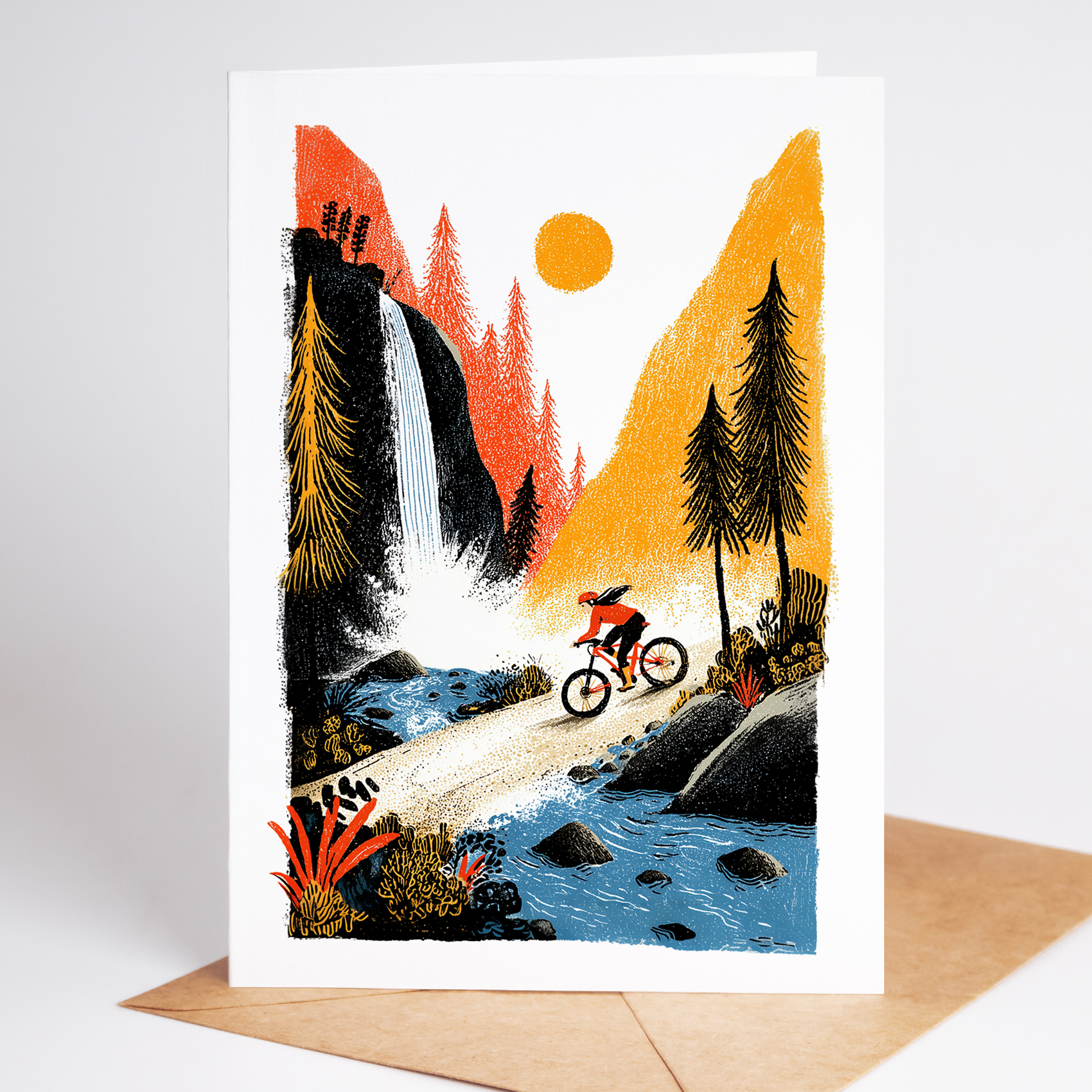 This set features ten illustrated scenes of a female mountain biker moving through forests, deserts, rivers, waterfalls, and alpine trails. Each card captures motion, light, and the feeling of being out on the trail with nowhere else to be.